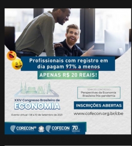 2021-08-30 corecon-al HomeÚltimas Notícias Inscrição para o XXIV Congresso Brasileiro de Economia tem preço especial para profissionais com registro em dia Inscrição para o XXIV Congresso Brasileiro de Economia tem preço especial para profissionais com registro em dia - 30 de agosto de 2021 - in Últimas Notícias 0 Comentários desativados em Inscrição para o XXIV Congresso Brasileiro de Economia tem preço especial para profissionais com registro em dia