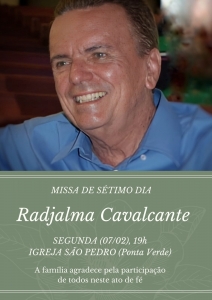 Será realizada hoje (segunda-feira, 7 de Fevereiro) a missa de 7° dia do nosso querido economista Radjalma Cavalcante na igreja de São Pedro, ponta verde ás 19h, a família agradece a todos nesse ato de fé.