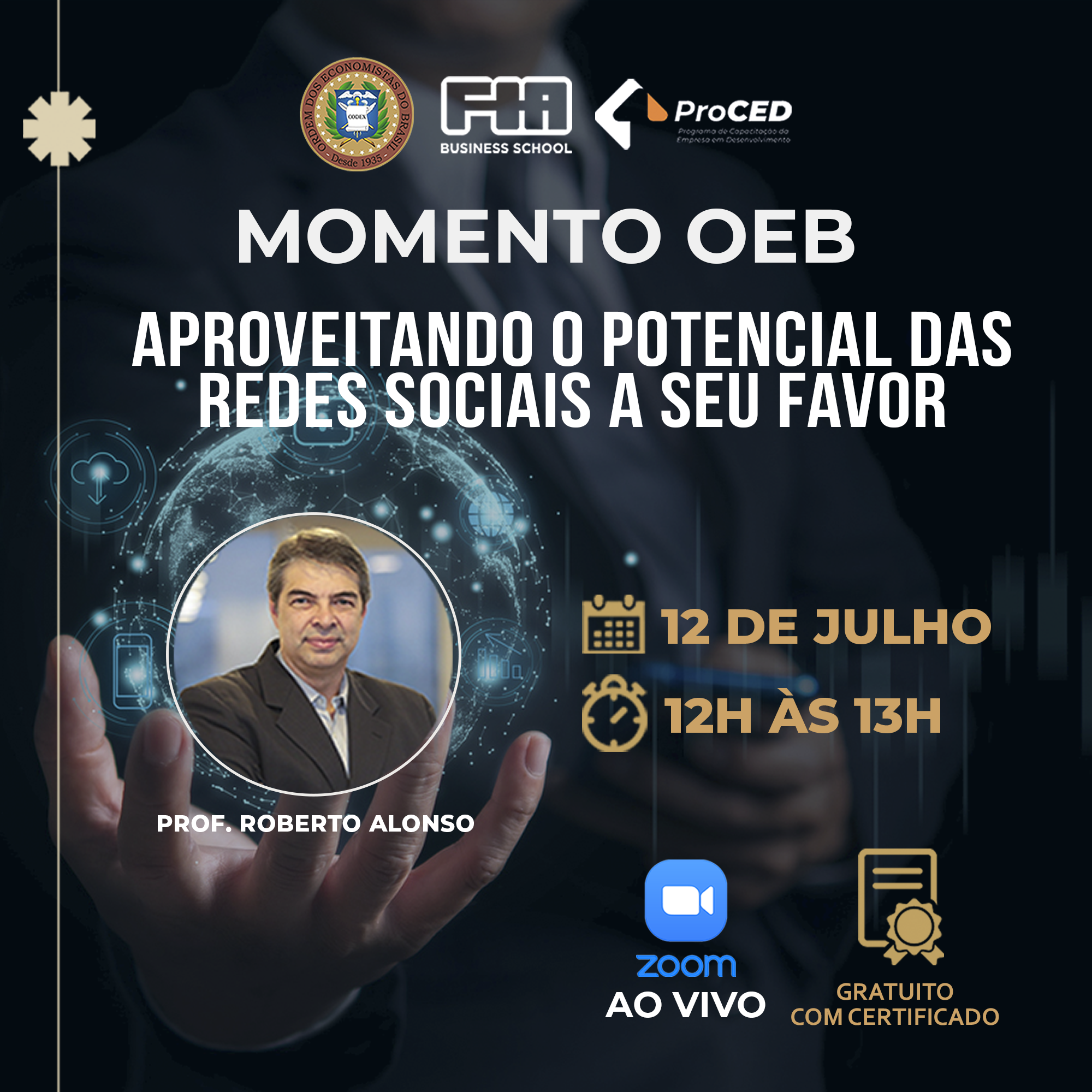 O relatório indicou ainda que as redes sociais mais utilizadas no Brasil são o Whatsapp, o Facebook e o Instagram (Grupo Meta). Pensando neste significativo alcance, como está a presença do seu negócio nas redes sociais mais utilizadas pelos usuários brasileiros? Em mais uma edição do MOMENTO OEB, a FIA e a Ordem dos Economistas do Brasil promovem o curso APROVEITANDO O POTENCIAL DAS REDES SOCIAIS A SEU FAVOR. Neste encontro, Roberto Alonso apresentará a importância das redes sociais para o perfil profissional e da empresa, a diferença entre redes e mídias sociais, e a importância de um planejamento estratégico para o direcionamento do marketing mais tático e operacional. Tópicos que serão abordados: