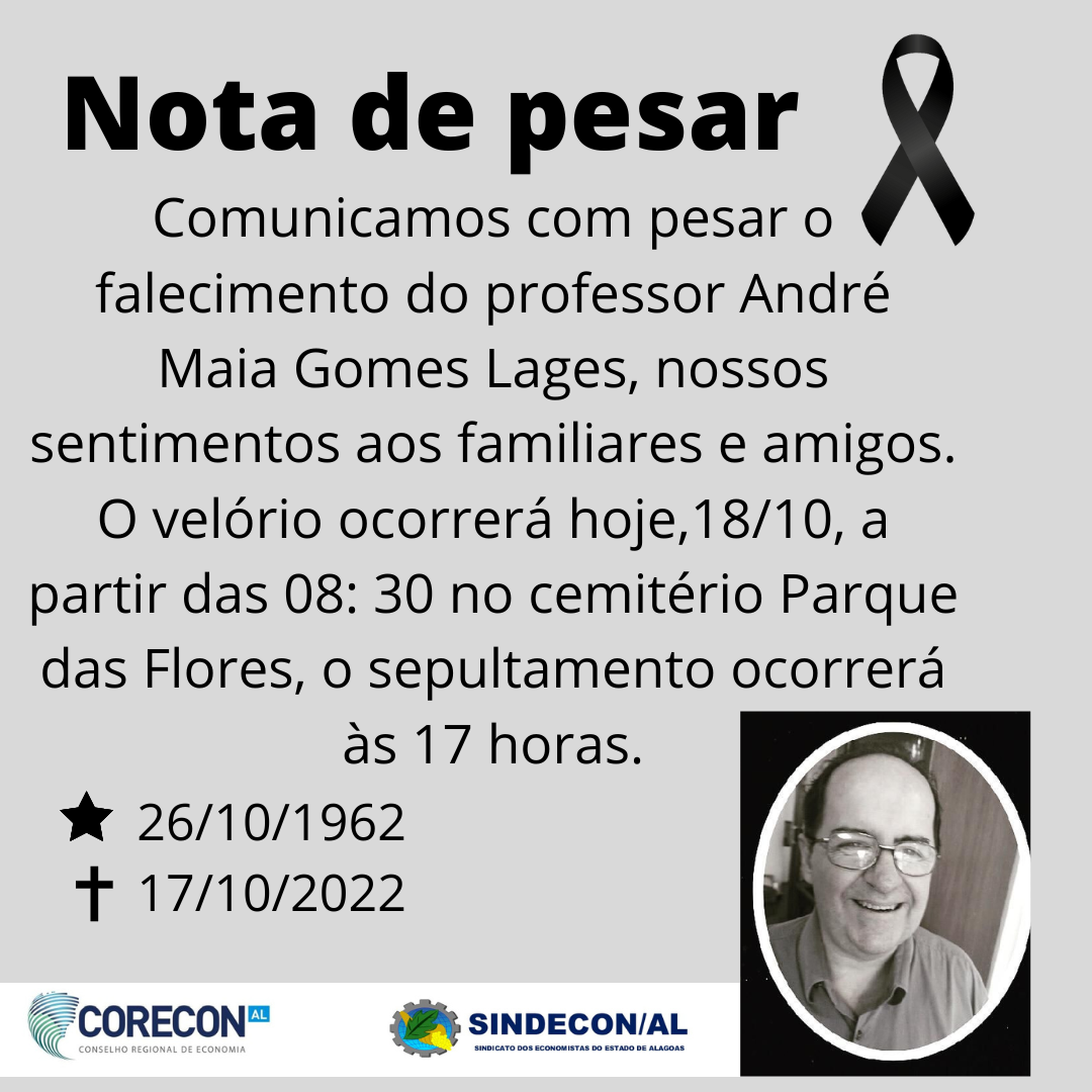 2022-10-18 corecon-al HomeÚltimas Notícias Corecon e Sidecon comunicamos com pesar o falecimento do professor André Maia Gomes Lages Corecon e Sidecon comunicamos com pesar o falecimento do professor André Maia Gomes Lages - 18 de outubro de 2022 - in Últimas Notícias 0 Comentários desativados em Corecon e Sidecon comunicamos com pesar o falecimento do professor André Maia Gomes Lages