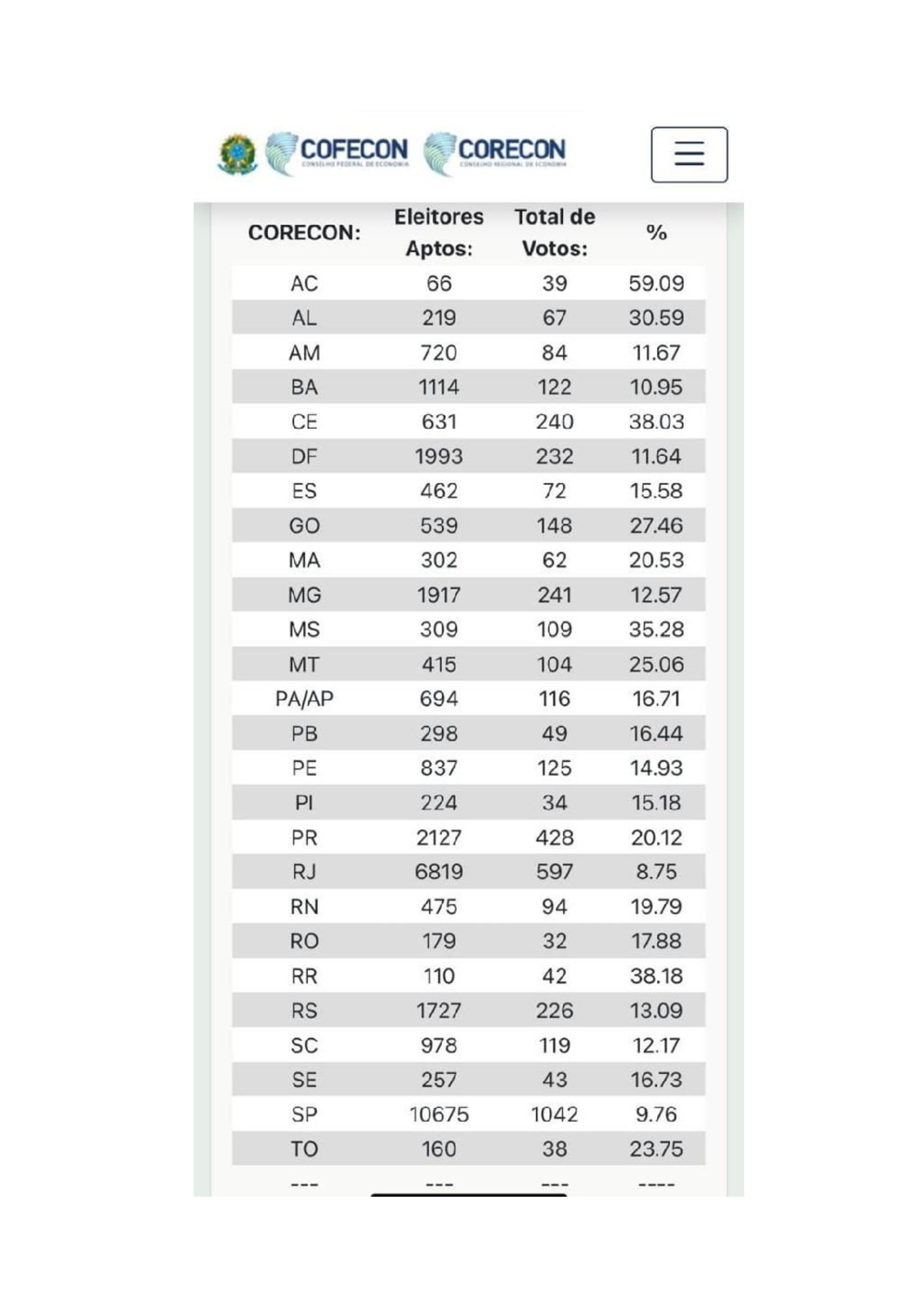 Sobre a classificação dos Corecons nessa eleição, Alagoas foi destaque, sendo o segundo colocado no Nordeste e o quinto ao nível nacional, mais uma vez, a categoria dos economistas alagoanos, reafirmou a confiança e dinamismo da gestão atual.