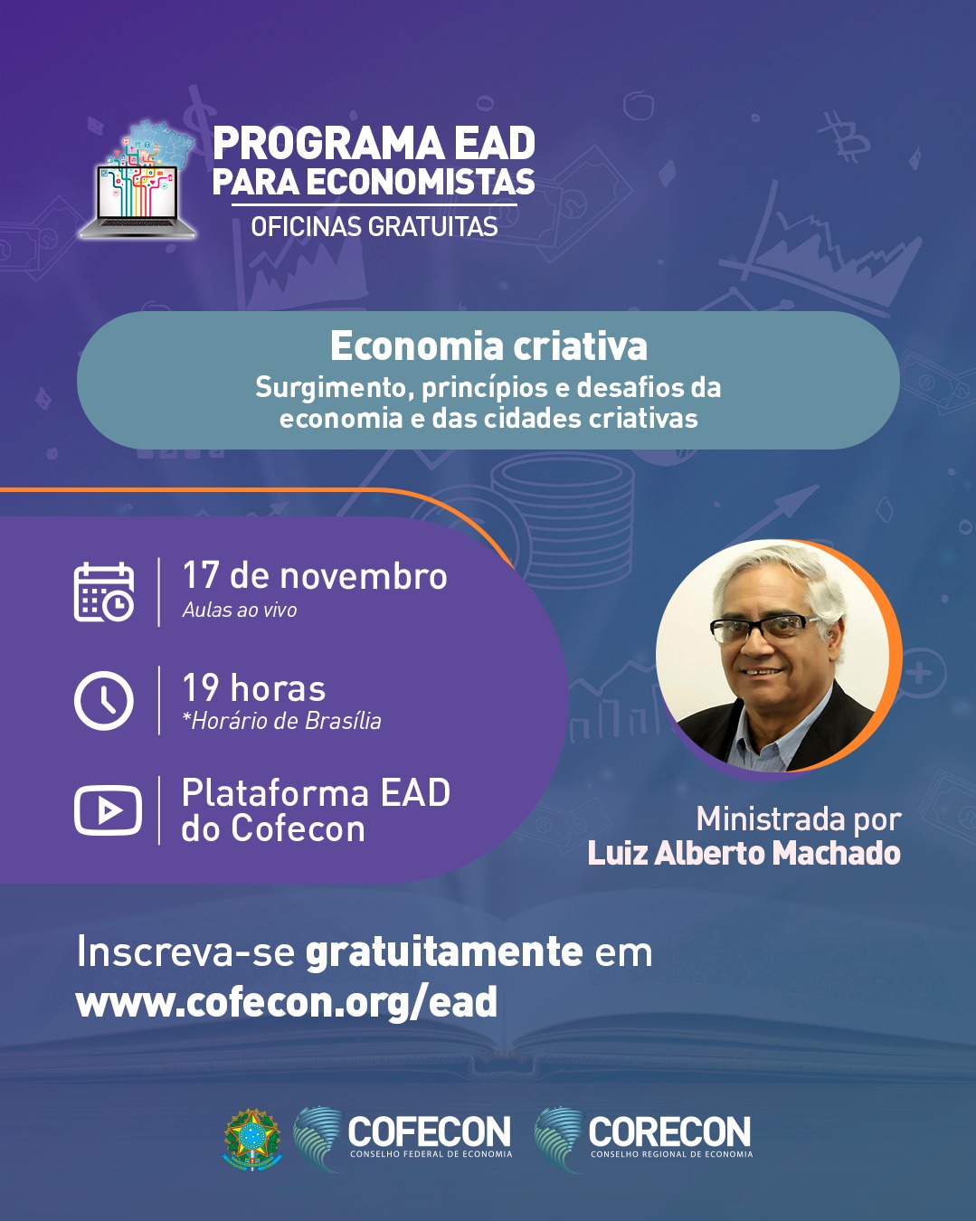 No dia 17 de novembro, às 19h, o Cofecon promoverá uma oficina online sobre economia criativa , com o Econ. Luiz Alberto Machado. A atividade terá duração de 1h30.