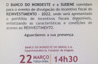 BNB, Sudene, Corecon e Sindecon AL convidam seus associados para participar da solenidade. Reinvestimento 2022 ...