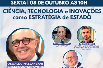 Participe do webinário de amanhã, às 10h! “Ciência, tecnologia e inovações como estratégia de Estado”, tema da mesa, terá o Profº. Oswaldo Massambani como expositor; Brigadeiro Pazini, André ...