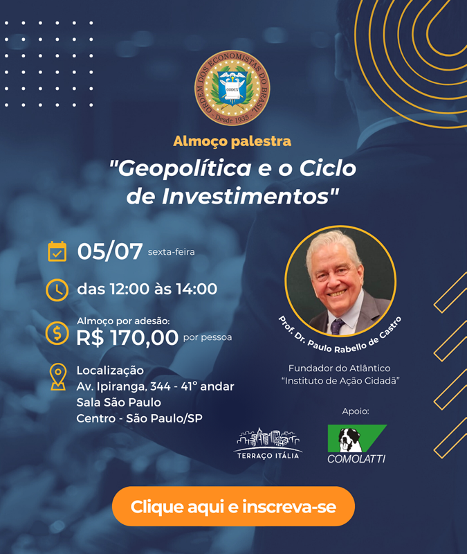 Almoço e palestra, será nesta sexta, 5, como o tema: “Geopolitica e o Ciclo de Investimentos” com o Prof. Dr. Paulo Rabelo