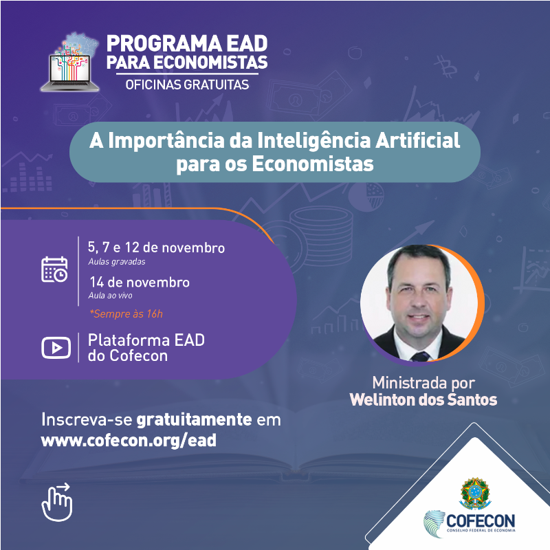Quer entender como o crescimento da inteligência artificial afeta a economia, o mercado de trabalho e a profissão de economista? Entre 5 e 14 de novembro (às terças e quintas) será realizada a oficina “A Importância da Inteligência Artificial para os Economistas”, com Welinton dos Santos como professor.