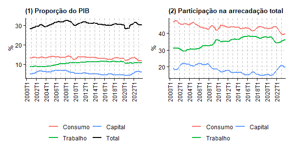 A Figura 1 resume a evolução de 2000 a 2023 da carga tributária por categoria de tributo e a participação percentual de cada categoria na arrecadação total, usando a média móvel de quatro trimestres. O gráfico (1) mostra a evolução da receita tributária como proporção do PIB para as categorias de tributos: consumo, trabalho e capital. A receita tributária de consumo se destaca como a principal fonte, enquanto a receita tributária do trabalho cresce gradualmente até 2020 e a do capital apresenta maior volatilidade.
