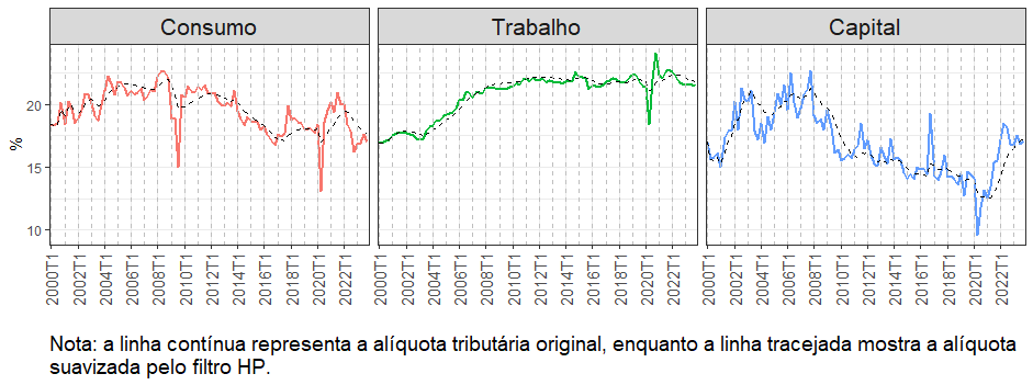 A Figura 2 mostra a estimativa das alíquotas efetivas de impostos sobre o consumo, trabalho e capital, com ajuste sazonal, no período de 2000T1 a 2023T4, junto com a tendência extraída pelo filtro HP para cada uma das séries.v Ver planilha com estimativas das alíquotas efetivas aqui.
