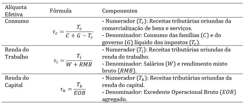 Nas Tabelas 1 e 2, apresentamos a classificação dos impostos nas categorias de consumo e renda, bem como os componentes da receita e da base tributária, juntamente com as fórmulas de cálculo das alíquotas efetivas proposta na metodologia de Azevedo e Fasolo (2015).i