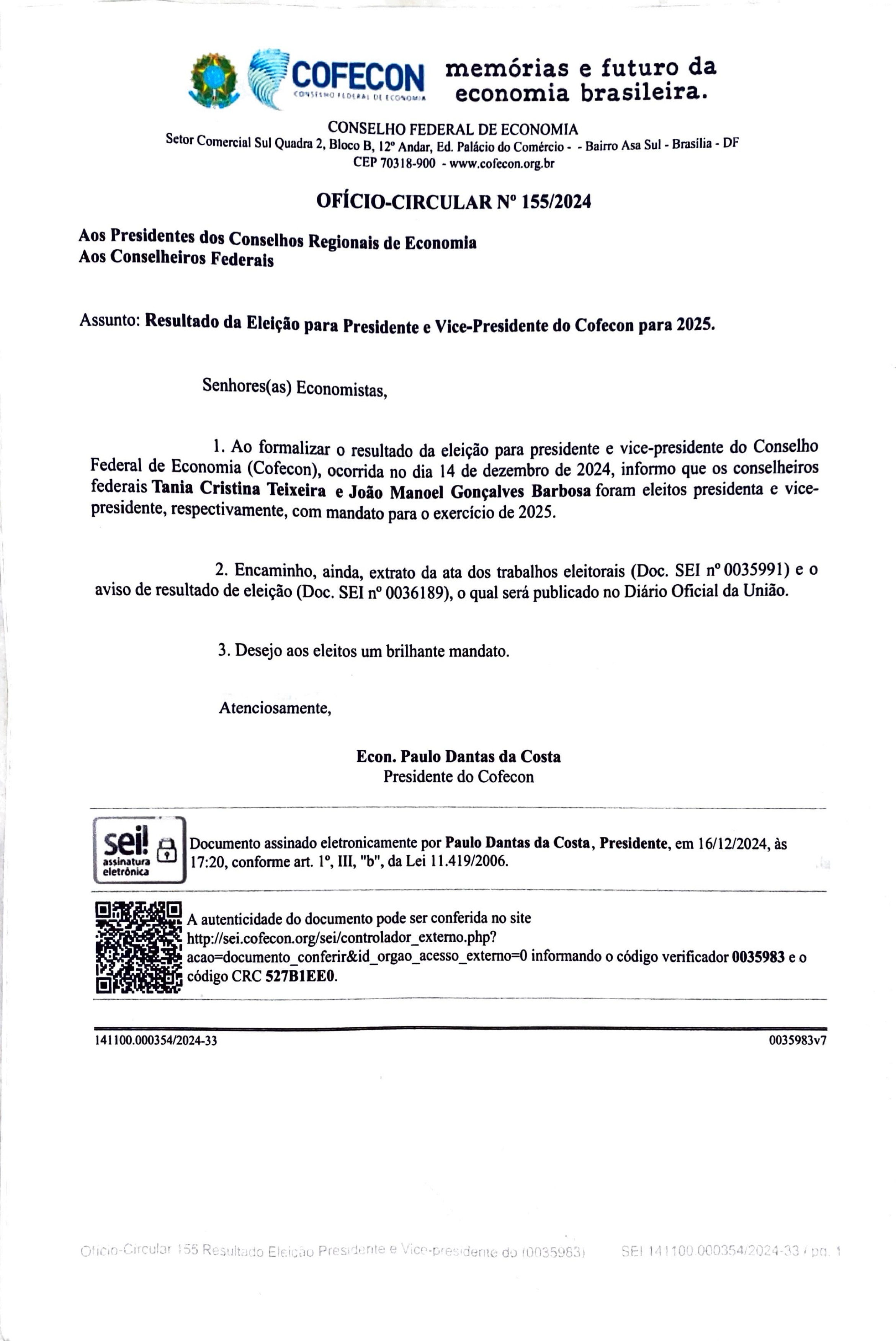2024-12-19 corecon-al HomeÚltimas Notícias Resultado da Eleição para Presidente e Vice – Presidente do COFECON para 2025 Resultado da Eleição para Presidente e Vice – Presidente do COFECON para 2025 - 19 de dezembro de 2024 - in Últimas Notícias 0 Comentários desativados em Resultado da Eleição para Presidente e Vice – Presidente do COFECON para 2025