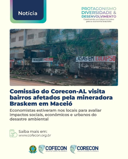 O plenário do Conselho Regional de Economia de Alagoas, em sua mais recente reunião, criou uma comissão para visitar alguns bairros afetados pela exploração de sal-gema por parte da mineradora Braskem, o que resultou no maior desastre ambiental urbano do mundo e causou a expulsão de aproximadamente 55 mil moradores de seus lares, prejudicando também os seus negócios, sem esquecer o valor sentimental dos imóveis, pois muitos moradores viviam há bastante tempo nesses bairros.