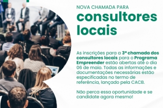 ATENÇÃO! Nova oportunidade para consultores locais! Está aberta a 3ª chamada do Programa Empreender. Quer transformar vidas através da Consultoria? Seja um dos nossos consultores! https://cacb.org.br/esta-aberta-a-3a-chamada-para-consultores-locais-do-programa-empreender/ ...