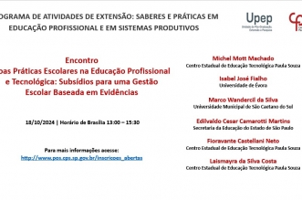 PROGRAMA DE ATIVIDADES DE EXTENSÃO: SABERES E PRÁTICAS EM EDUCAÇÃO PROFISSIONAL E EM SISTEMAS PRODUTIVOS Encontro Boas Práticas Escolares na Educação Profissional e Tecnológica: Subsídios para uma Gestão ...